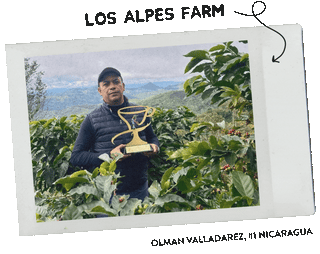 NICARAGUA #1: Los Alpes’ natural Geisha captured first place in the Presidential category of the Cup of Excellence for the second year running, scoring 91.10. It opens with bright tropical fruit and honeyed notes, unfolds into juicy stone fruit and delicate florals, and finishes with soft chocolate and lingering sweetness. Silky and vibrant, it reflects Olman Valladarez’s research-driven care and multi-generational passion.