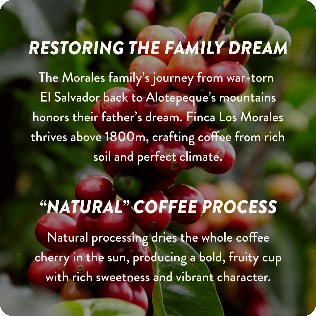 Los Morales’ Geisha is a coffee shaped by both passion and place. Grown at 5,905 feet on the slopes of Alotepeque, this lot captures the elegance and complexity of Geisha, nurtured by volcanic soil, cool mountain air, and the careful hands of the Morales family. Only the ripest cherries are picked by hand each January, then slowly transformed in the family’s on-site mill. Small pulpers, solar drying tunnels, and African beds allow the coffee to develop with patience and attention at every stage.