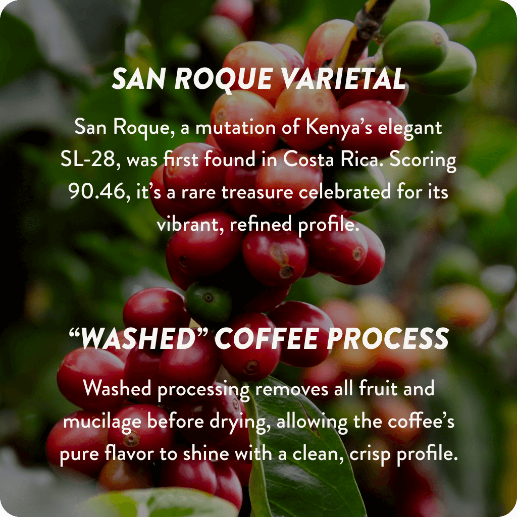 This San Roque from Don Cayito’s Quebrada Grande farm is a standout coffee that brings the dedication of the Calderón family to every cup. Grown at 6,069 feet and processed using the traditional washed method, it earned third place in the 2024 Cup of Excellence Costa Rica with a score of 90.46, showcasing both precision and care at every stage.