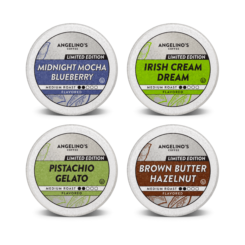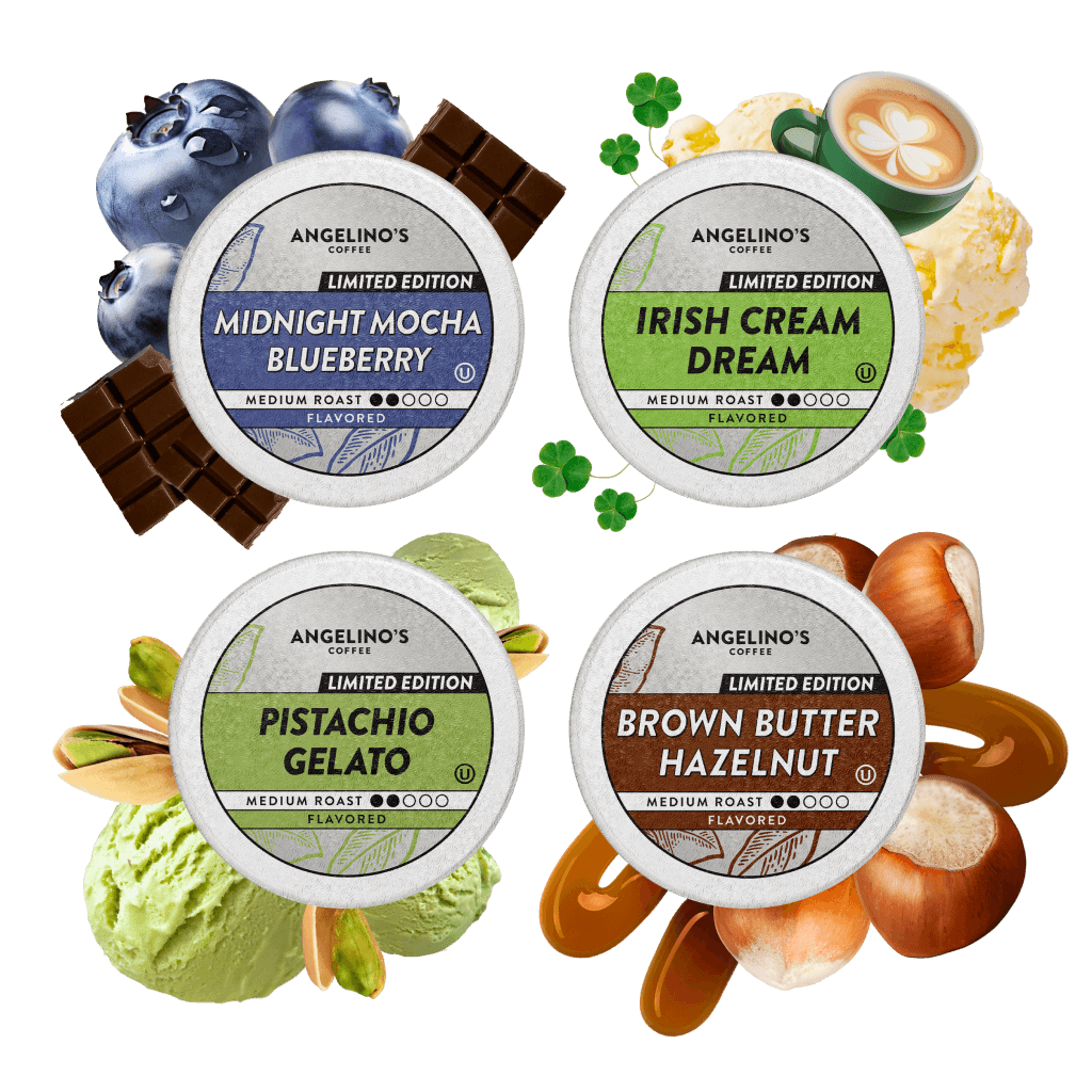 Our Seasonal Flavor Variety Pack has the perfect combination of all your coffee favorites: Silky smooth Irish Cream, rich and bold Midnight Mocha Blueberry, decadent Brown Butter Hazelnut, and the creamy yet nutty Pistachio Gelato. Includes 6 of each. This item won't last long so grab one while it lasts!